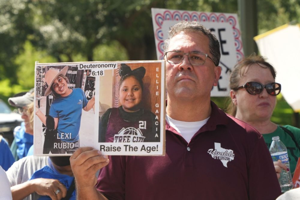 2022年5月30日,在美国得克萨斯州南部尤瓦尔迪市发生枪击事件的小学,人们悼念遇害者。新华社记者吴晓凌摄